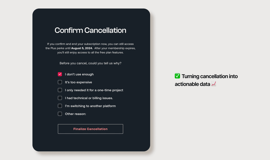 Users wanted a clear, factual reminder of what changes when they cancel. It read as fairness—not a dark pattern—but it also worked as a healthy friction point that reduced impulsive exits. We also made the exit survey required, treating every cancellation as high-signal data to improve the product.