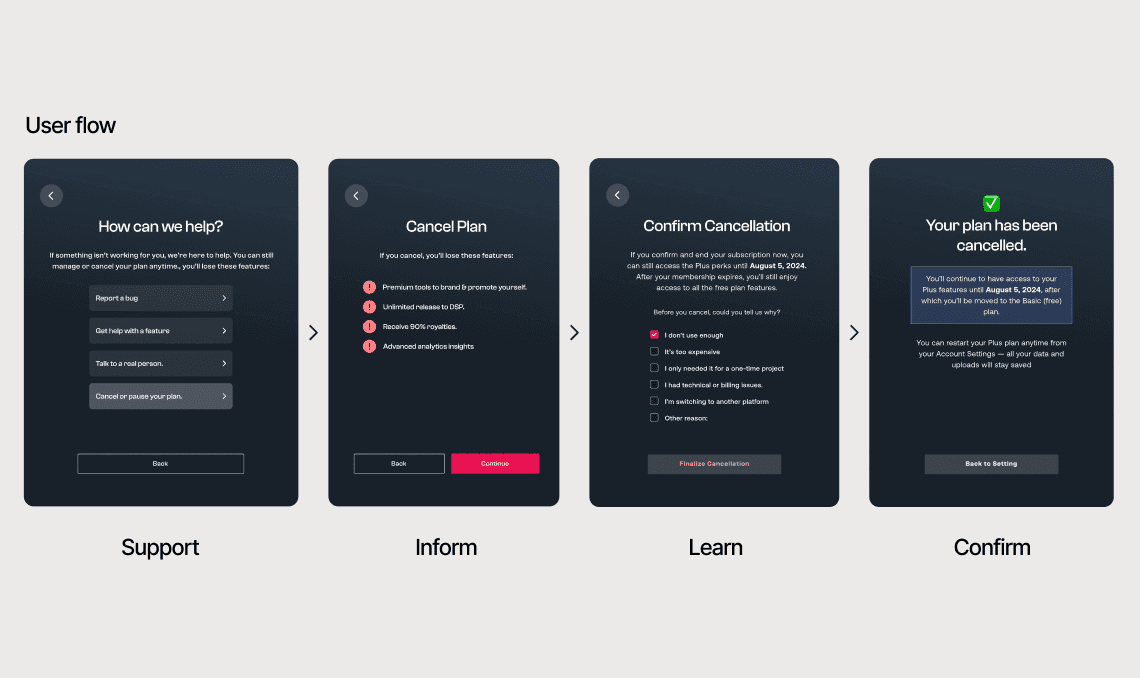 This project showed that cancellation isn’t just a churn problem—it’s a trust moment. By leading with help, keeping exits honest, and being clear about consequences, we gave users control without pushing them away. In the process, cancellation became a source of clarity and learning, helping the product improve while reinforcing a relationship built on transparency rather than friction.