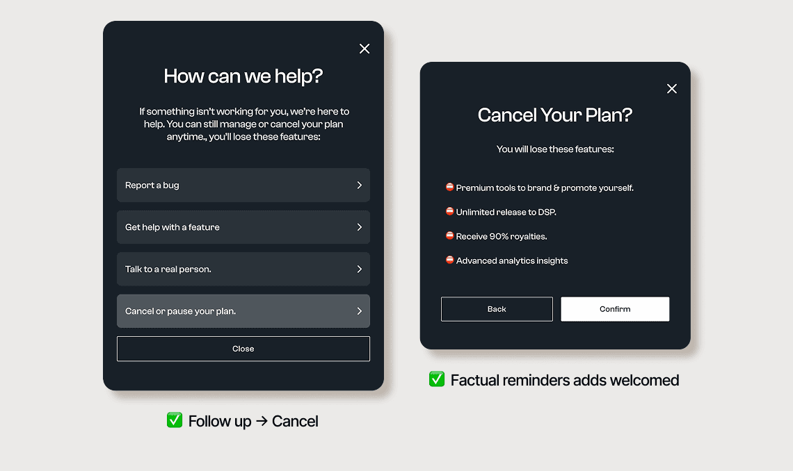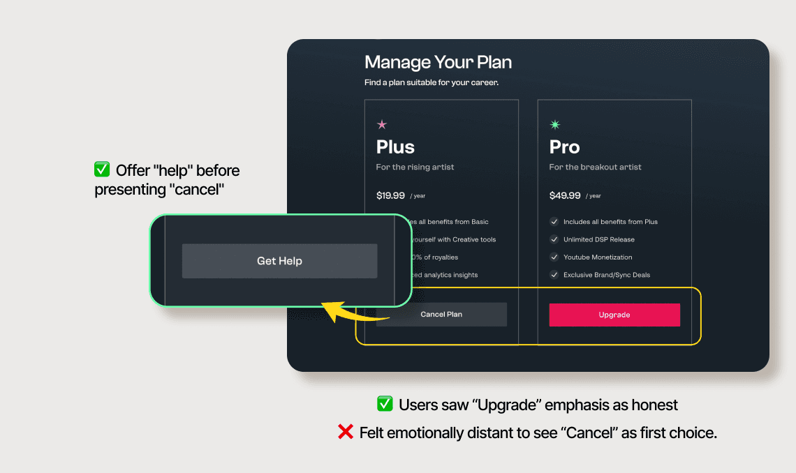 Beyond task completion, users gave strong emotional feedback. They were comfortable with “honest bias”—making upgrades and higher-tier plans more prominent—because the intent felt clear. What they flagged was showing “Cancel” upfront, before they’d even expressed a problem. It planted the idea of leaving and made the product feel distant. Shifting the primary action to “Get help” set the right tone first—support, then exit—while keeping cancellation easy to find when needed.